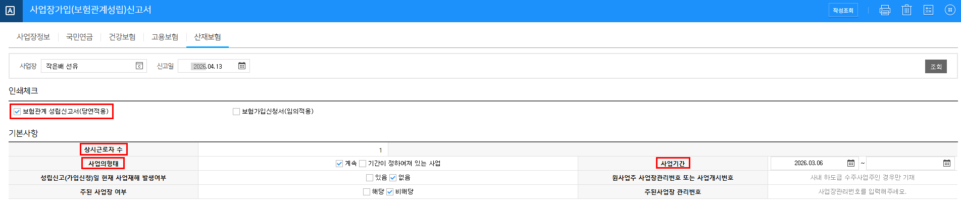 사업장가입(보험관계성립)신고서를 작성합니다.